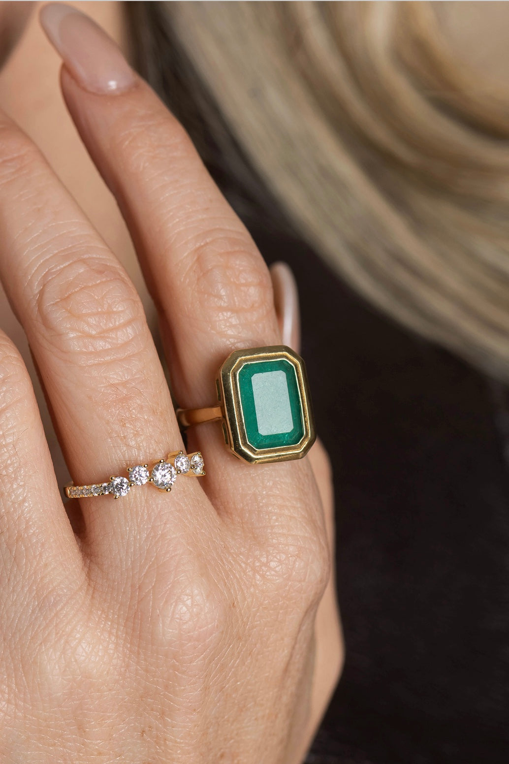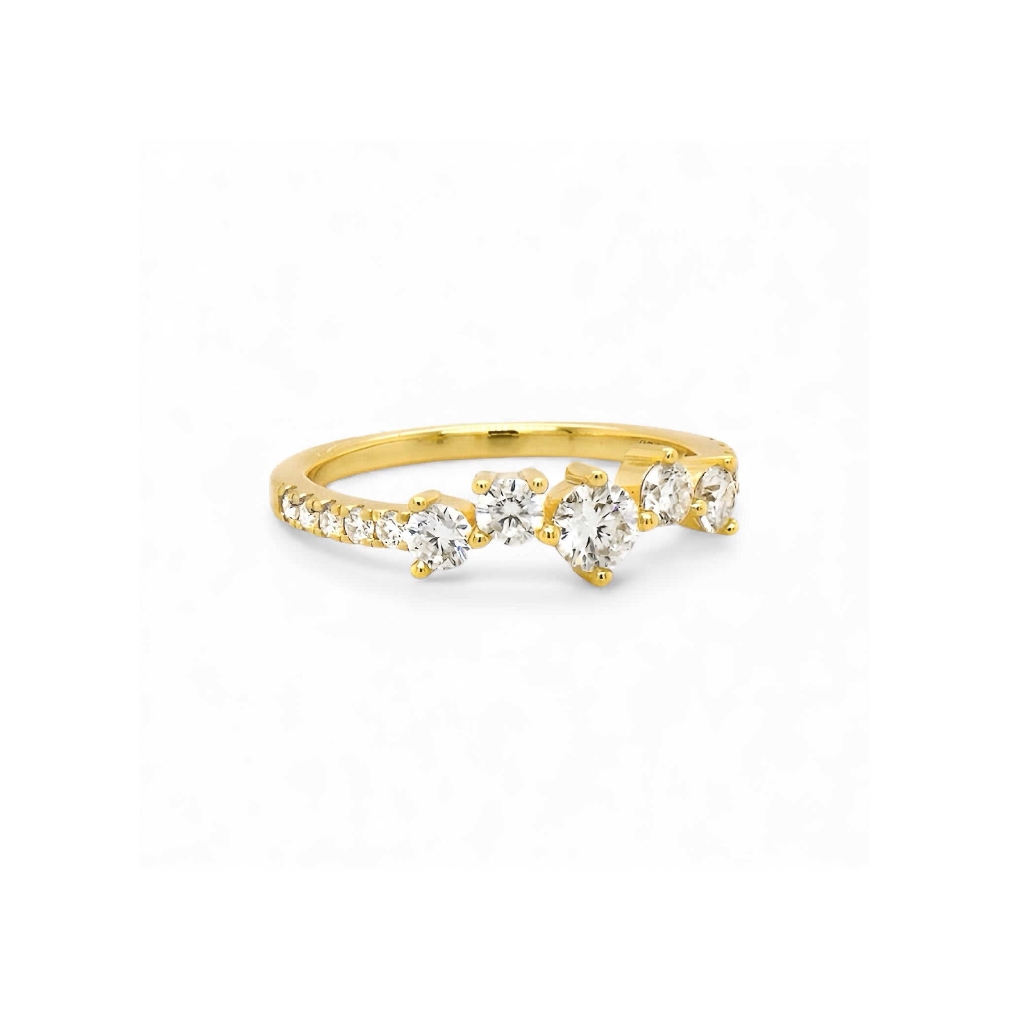 El Anillo Aurora reúne Moissanitas de corte brillante que reflejan luz con una intensidad superior, ofreciendo ese fuego característico que supera incluso al diamante en destello.