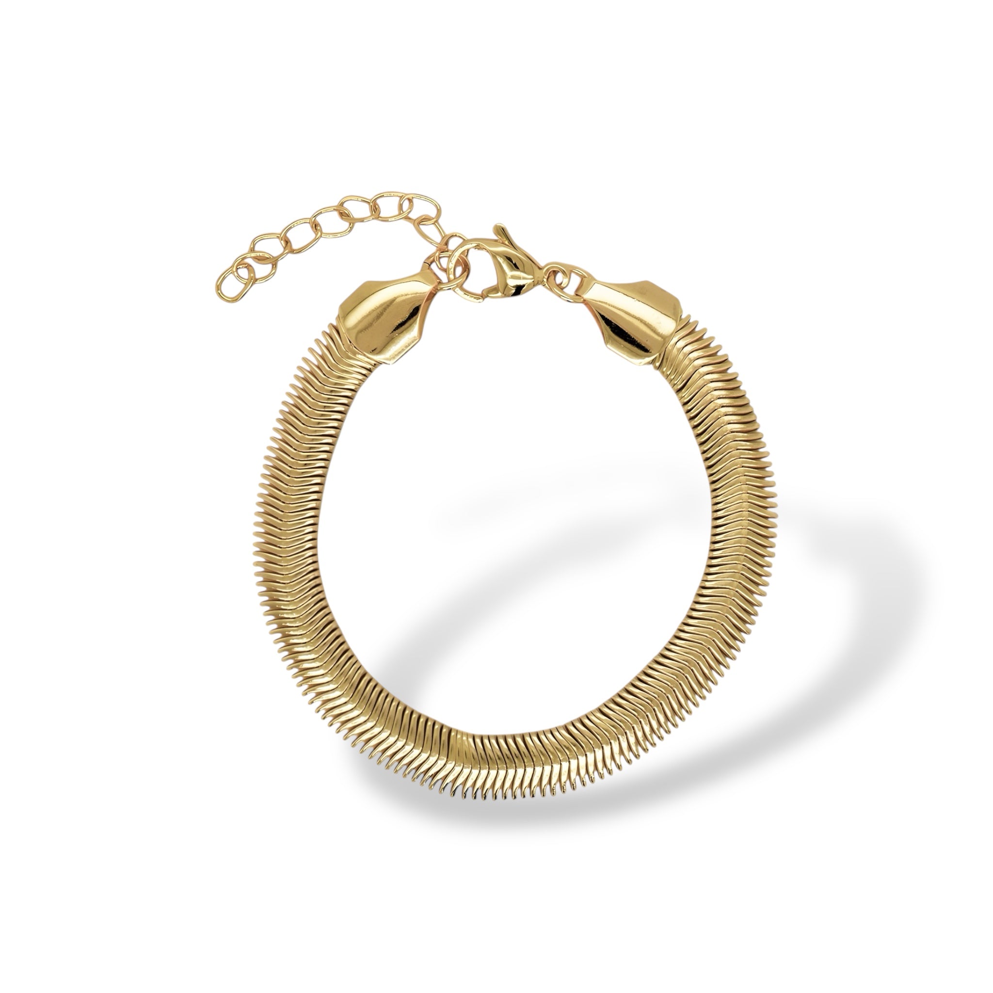 La Pulsera Snake Victoria es de chapa de oro, con un diseño tipo “serpiente” que abraza la muñeca con suavidad y elegancia. Su acabado liso y brillante la hace perfecta para combinar con todo — desde un look casual hasta un outfit de noche.