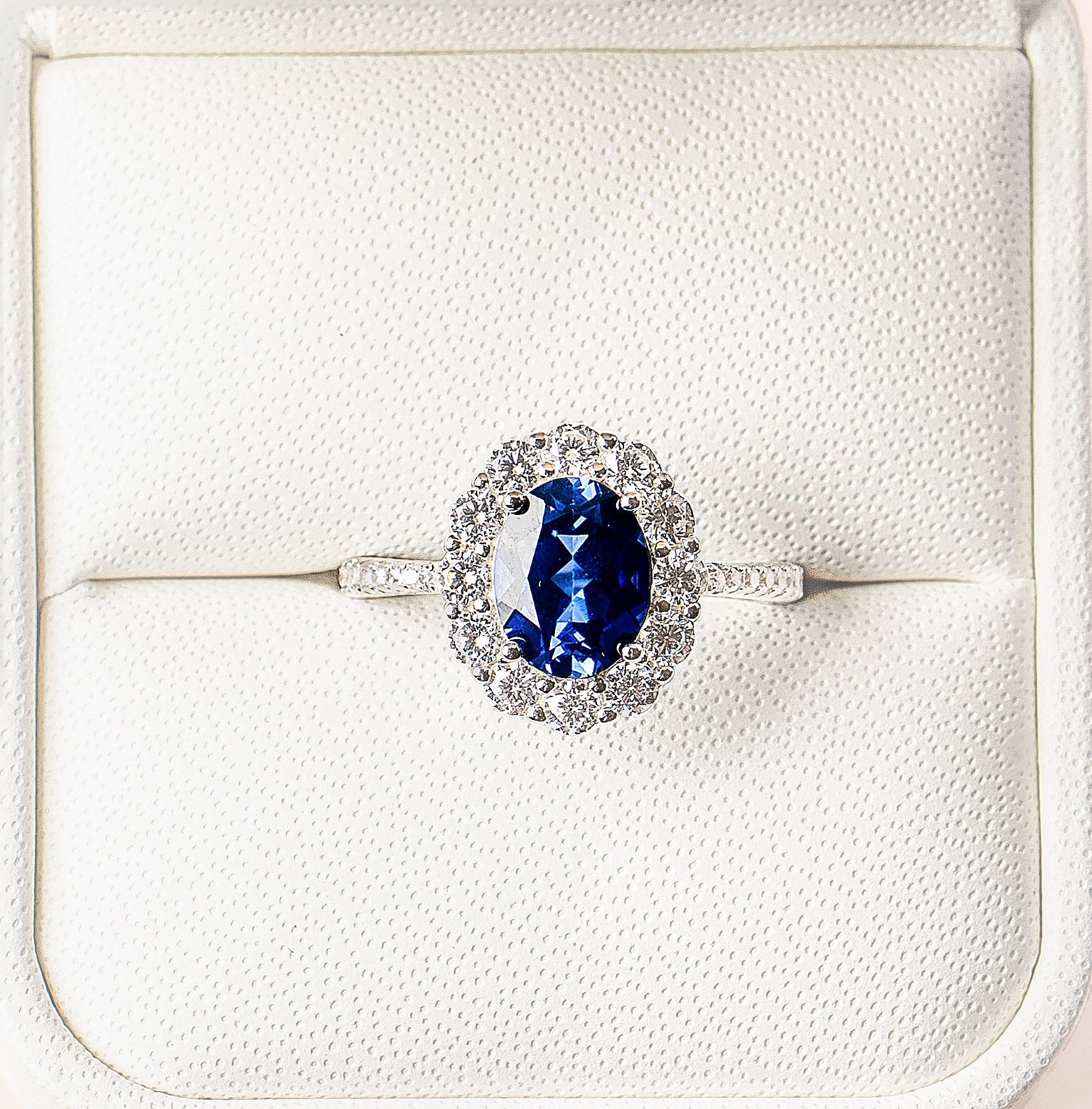 ✨ Uno de nuestros Best Sellers más elegantes está de regreso.Este anillo icónico conquista por su belleza, su historia y su diseño atemporal. El zafiro azul ovalado es el protagonista, rodeado por un halo de zirconias premium que multiplican el brillo con cada movimiento.