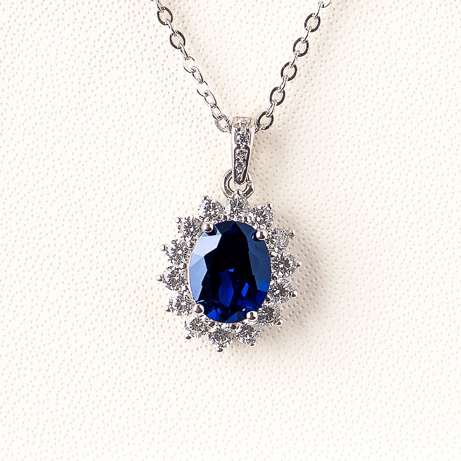 ✨ Lleva contigo la elegancia del azul real.Esta cadena de Plata Fina .925 presenta un zafiro azul (simulado) en corte ovalado, rodeado por un halo de zirconias premium que imitan el resplandor de los diamantes.