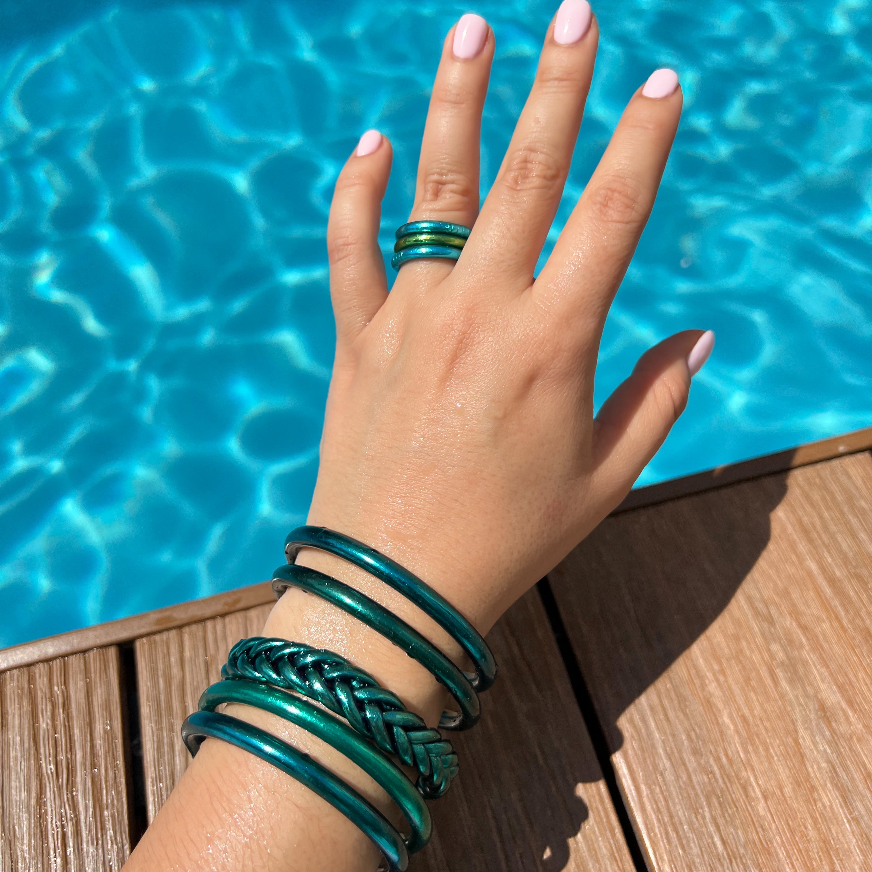 Por fuera están protegidas con silicona flexible y resistente al agua, lo que las hace súper cómodas y duraderas 🧿💖 - Son unas pulseras silenciosas. Al usarlas no hacen ruido.