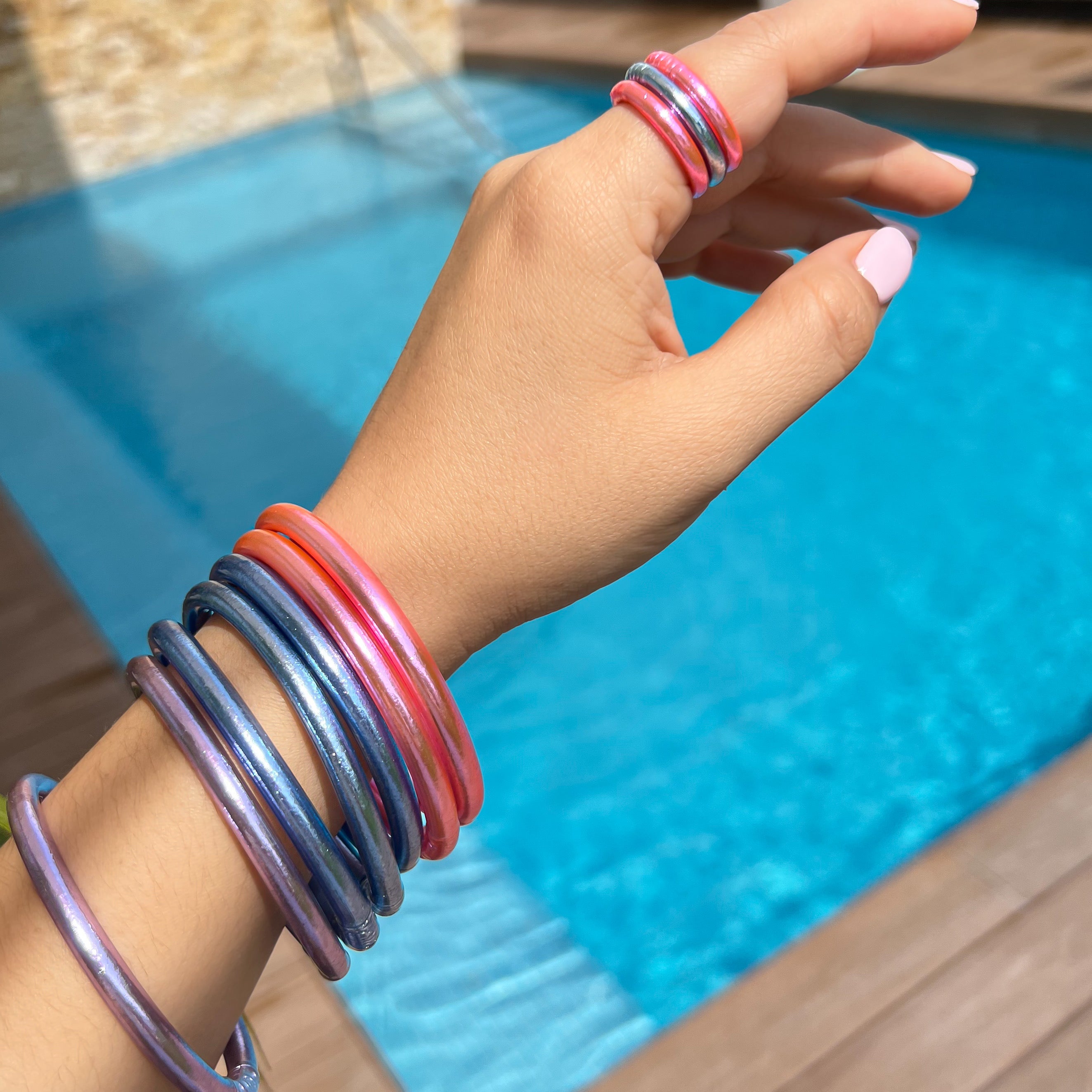 Por fuera están protegidas con silicona flexible y resistente al agua, lo que las hace súper cómodas y duraderas 🧿💖 - Son unas pulseras silenciosas. Al usarlas no hacen ruido.