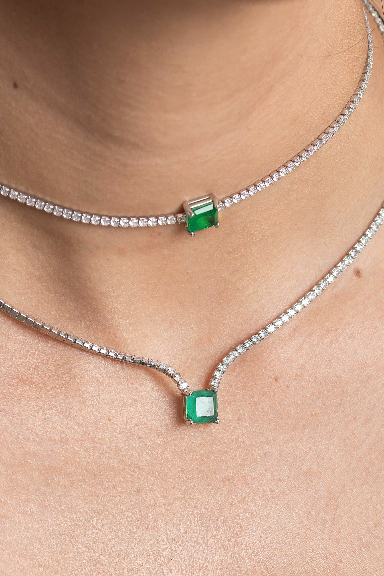 Esta hermosa gargantilla de esmeralda está hecha de una cadena de pavé flexible de plata esterlina y una esmeralda hecha en laboratorio.